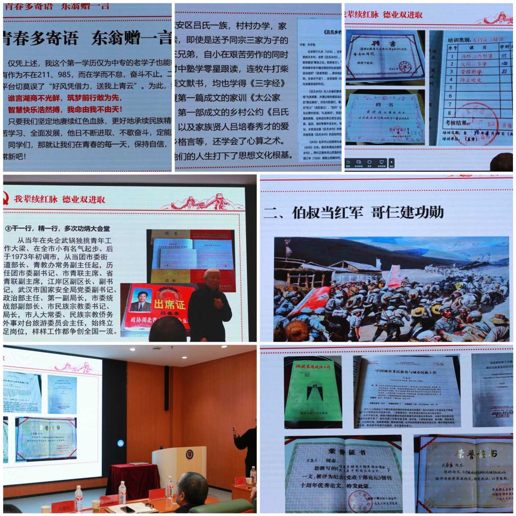 红色家史溯初心,烽火岁月显担当。讲座伊始,吕盛东先生以家族故事为“活教材”,将师生带回那段峥嵘岁月:伯父早年参加红三师,在战斗中身负重伤,父亲连夜奔波数十里山路,用竹篼将其抬回隐蔽养伤;小叔吕邦骅1934年参军,1947年在四平战役中壮烈牺牲,父亲每年清明都带全家祭扫,“眼泪怎么也止不住”;1937年,为解决抗日游击队“盐荒”,父亲带领乡亲以芝麻“置换”日商食盐,又冒死翻山送达山区,“人人汗流浃背,赛过一趟马拉松”。父亲为子女取名“东、方、红、太、阳”,带长孙瞻仰向警予烈士墓,将“红根”深植后代心中。